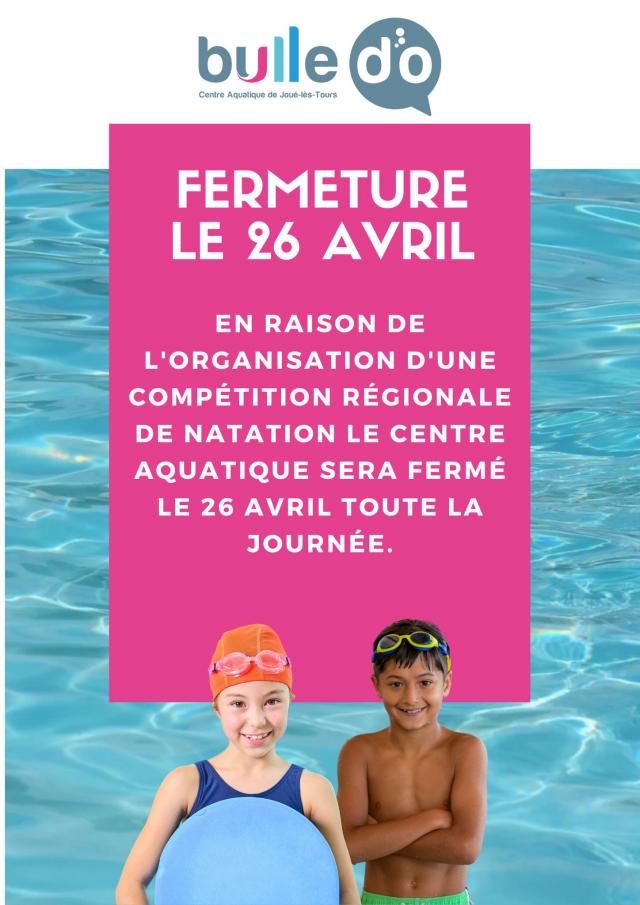 Nous vous informons qu'en raison de l'organisation d'une compétition régionale de natation, votre centre aquatique sera exceptionnellement fermé le dimanche 26 avril toute la journée.